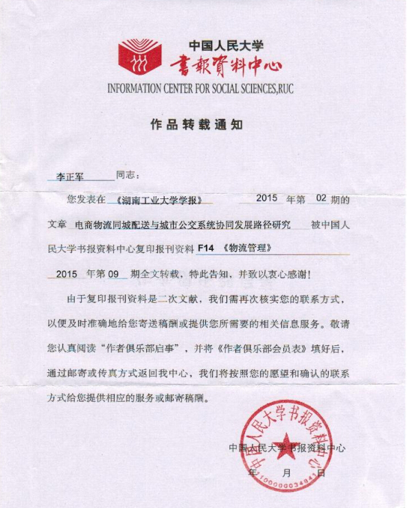 近日,传来喜讯,我所李正军所长与2013级硕士研究生李青桁撰写的论文《电商物流同城配送与城市公交系统协同发展路径研究》(发表在《湖南工业大学学报》社科版2015年第2期)被“人大复印资料”全文转载。此事受到学校期刊社张凤华处长的高度肯定。