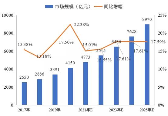 从国内看,伴随着我国城乡居民收入水平不断提高,消费者对食品的多样性、营养性、口感需求亦大幅提升,加之生鲜电商市场快速崛起,共同助推冷链物流行业进入了发展快车道。据中物联冷链委、中商产业研究院等公开数据显示,2015—2019年国内冷链物流市场规模持续扩大,年均复合增长率约为17%,2019年冷链物流行业的市场规模达到3391亿元人民币,同比增长达17.50%,2020年整体市场规模预计实现近年来最大幅度扩张,产值超4000亿元,到2021年将有望超4500亿元大关,考虑到未来增长势头不减,按此增速测算,到2025年我国冷链物流市场规模将进一步跃升达到约8970亿元(图2)。