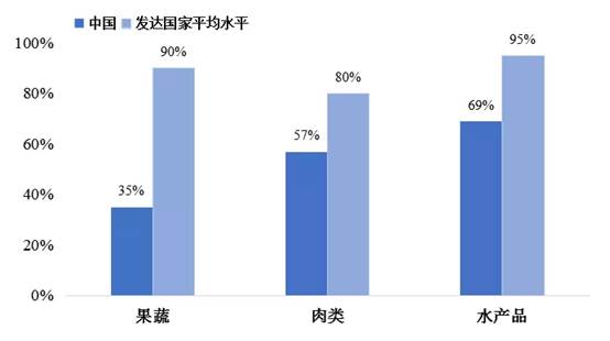 我国冷链物流前段后端设施相对而言不够完善,使得大多数生鲜商品在运输过程中得不到规范的保温、保湿、冷藏,加大了流通损耗,也加大了从农户到消费者的价格、品质不稳定因素。一是冷藏车等配套设施保有量少。冷藏车是冷链物流最主要的运输工具,中物联冷链委数据显示,2019年我国冷藏车保有量约21.47万辆,较2018年增加3.47万辆,仅达到美国、日本等先进国家2013年的水平,不仅绝对额不足,技术水平亦偏低。二是冷藏运输率低。目前,我国初级农产品冷链运输率相对发达国家而言一直偏低,发达国家已经达到80%-90%之间的水平,而我国果蔬、肉类、水产品冷藏运输率分别仅有15%、57%、69%(图6)。三是“断链”时有发生。在我国,冷链断链所导致的农产品腐损率是发达国家的1~2倍(图7)。据估算,我国每年因冷链“断链”造成约1200万吨水果、1.3亿吨蔬菜的浪费,经济损失超千亿元,加大了粮食安全的风险。四是信息化支撑力度偏弱。目前,冷链物流信息化程度较低,从产地到消费者无法及时获取到匹配的链条信息,导致产需不对等。《证券时报》称,据不完全统计,截止2020年底,仅有北京、天津、上海、浙江、福建、广东等逾十个省市可以实施冷链食品追溯,因此看来信息化支撑冷链物流发展未来还有很大的提升空间。
